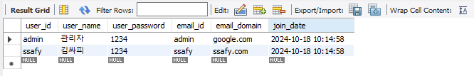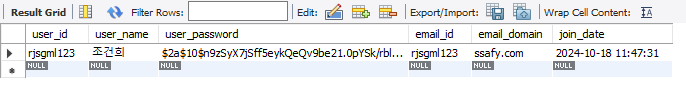 기존에는 비밀번호는 암호화를 적용하지 않는 raw 상태로 저장되어 있습니다. DB의 `members` 테이블을 SELECT로 조회를 하면 user_password에서 확인할 수 있습니다.