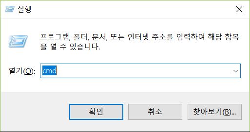 ▲ 실행 창에 "cmd" 를 입력하여 실행합니다.