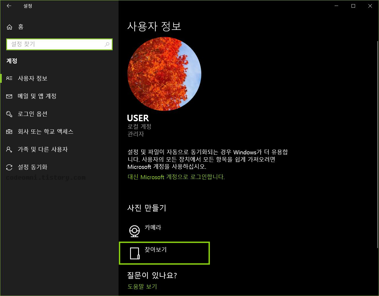 ▲ 설정 : 사용자 정보에 있는 사진 만들기의 찾아보기 버튼을 클릭합니다.