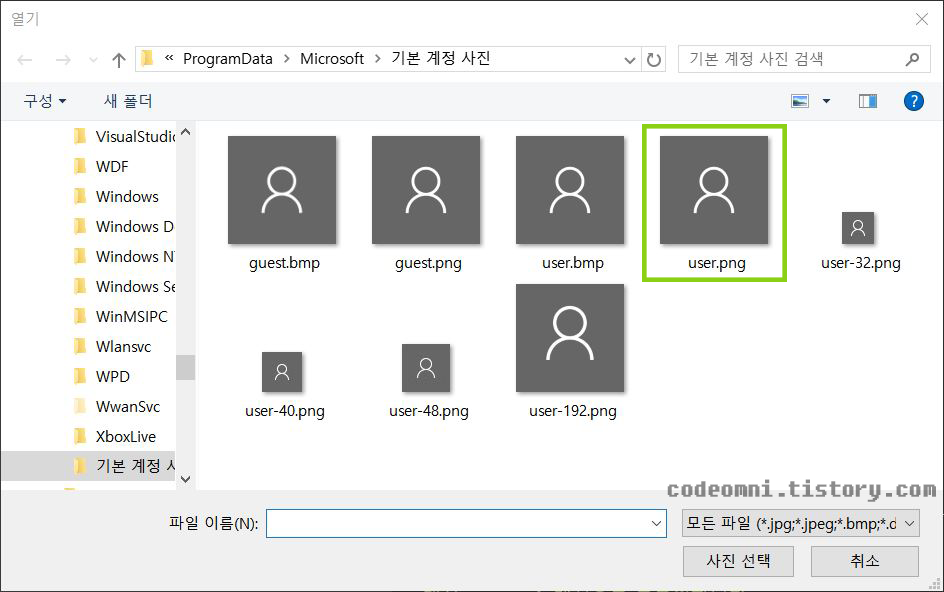 ▲ 그 중에서 "C:\ProgramData\Microsoft\User Account Pictures"경로에 들어가서 "user.png" 파일을 지정합니다.