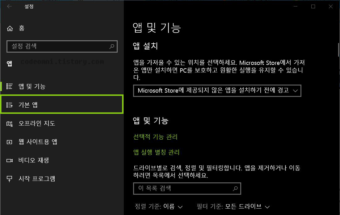 ▲ 그 중에서 오른쪽 네비게이션 메뉴에 있는 기본 앱을 선택합니다.