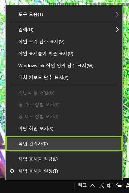 ▲ 클릭하면 나오는 메뉴에서 작업 관리자(K)를 클릭합니다.