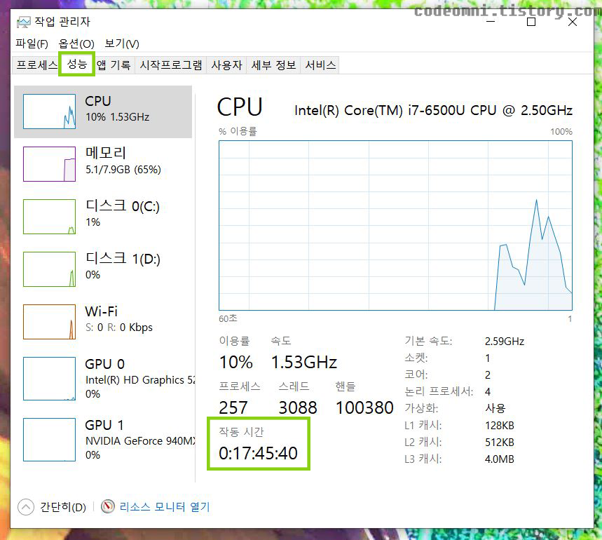 ▲ 성능 탭에 있는 CPU에서 작동 시간을 확인합니다.