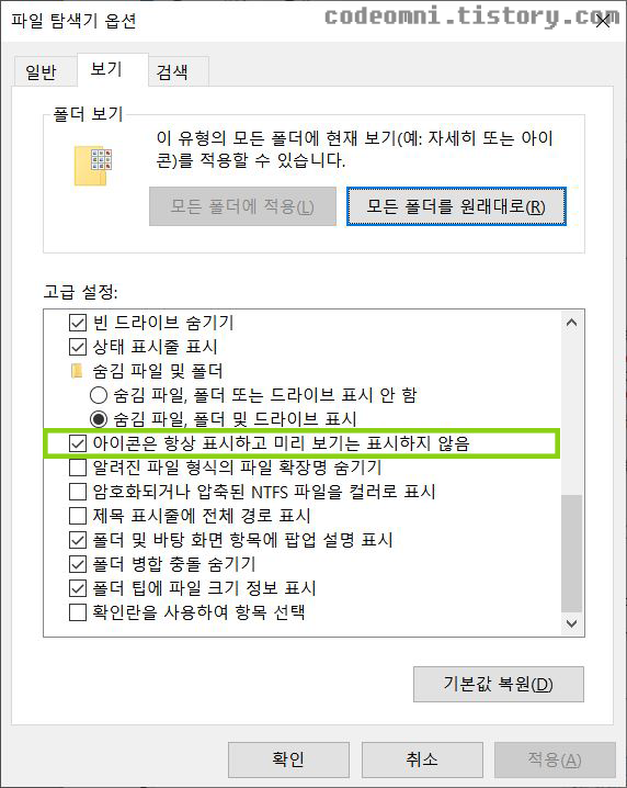 ▲ 아이콘은 항상 표시하고 미리 보기는 표시하지 않음을 통해 변경하면 됩니다.