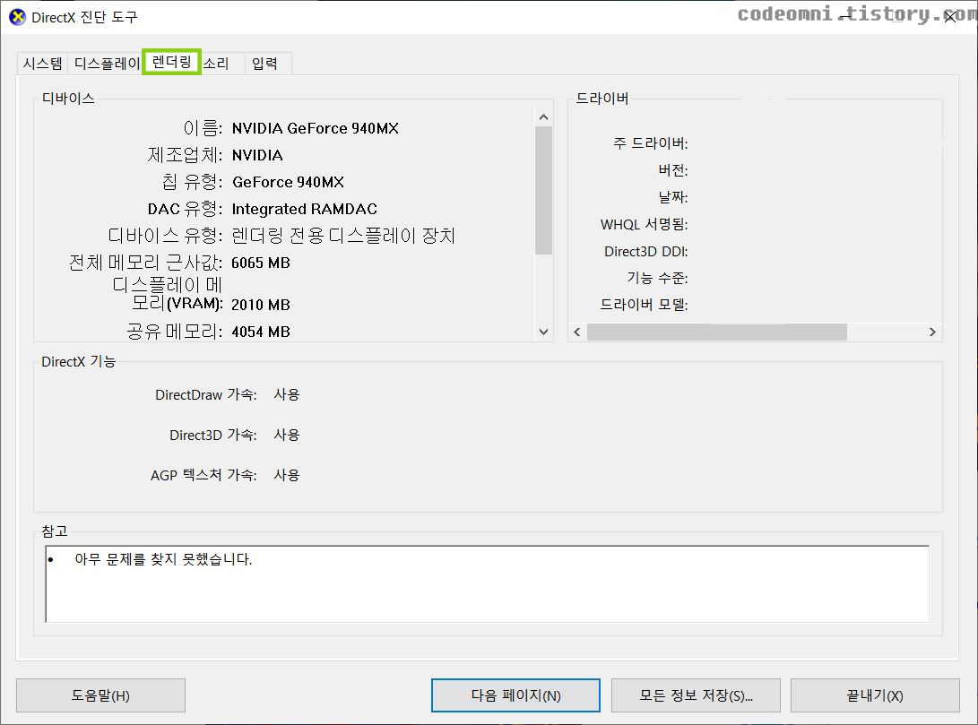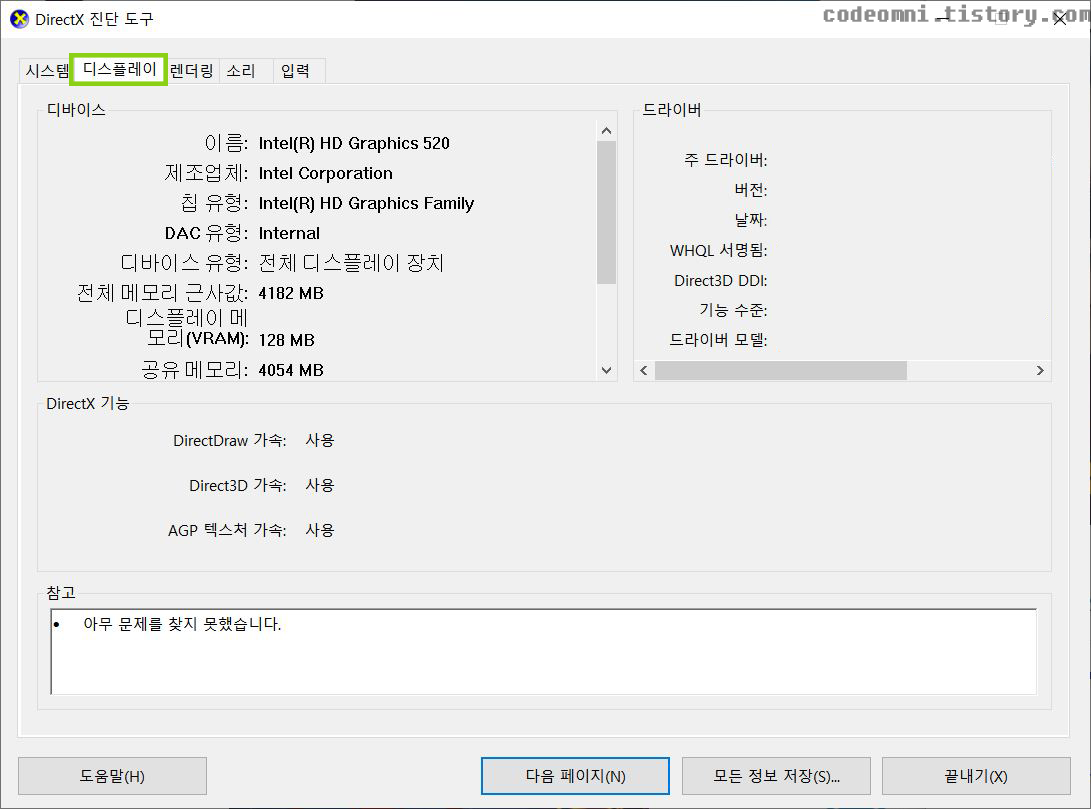 ▲ 주 드라이버, 버전, 날짜, WHQL 서명됨, Direct3D DDI, 기능, 드라이버 모델을 확인 할 수 있습니다.
