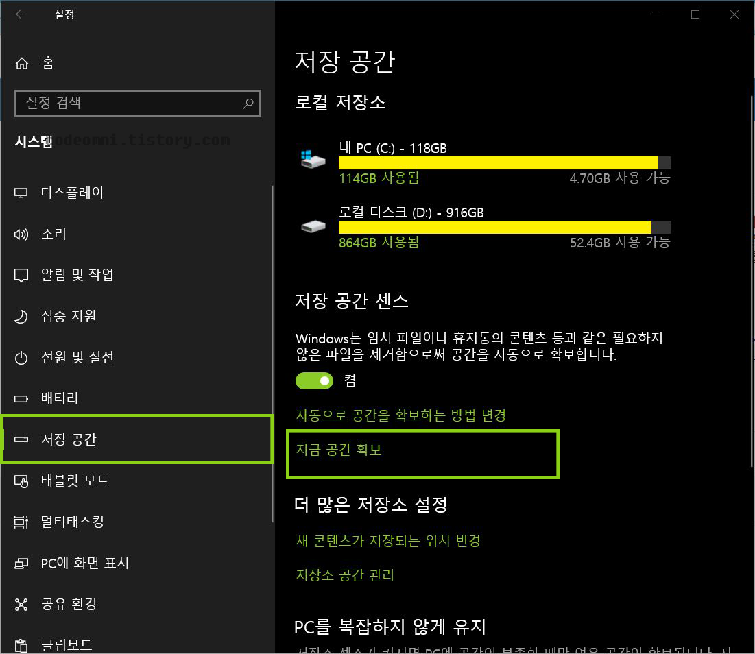 ▲ 저장 공간 중에 지금 공간 확보를 클릭합니다.