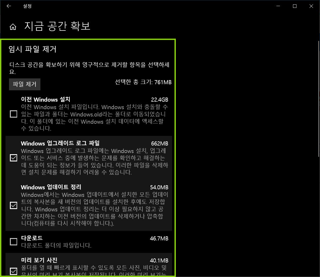 ▲ 임시 파일 제거에서 이전 Windows 설치, Windows 업그레이드 로그 파일, Windows 업데이트 정리, 다운로드, 미리보기 사진, 배달 최적화 파일, 휴지통, 임시 인터넷 파일, 시스템에서 생성한 Windows 오류 보고 파일 등을 삭제할 수 있습니다.