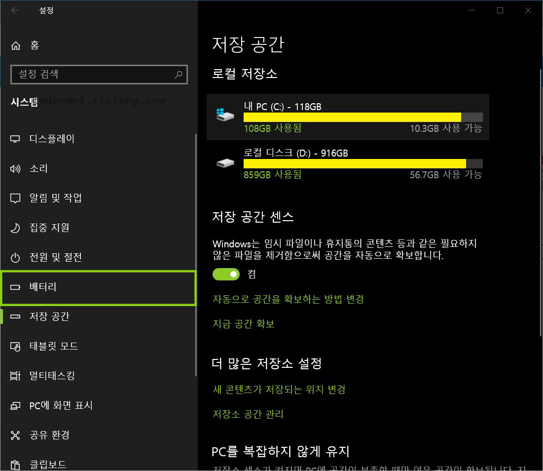 부족한 윈도우10의 저장 공간을 확보하는 방법입니다.