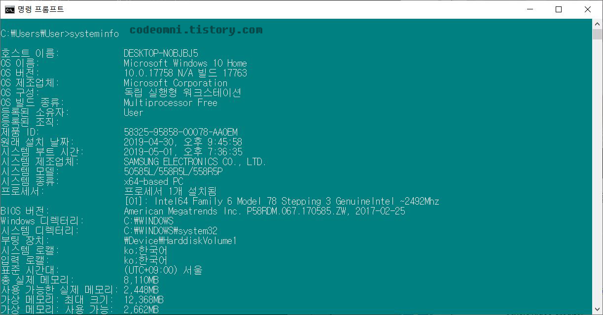 ▲ "systeminfo"를 입력하여 사용하고 있는 컴퓨터의 정보를 알아봅니다.