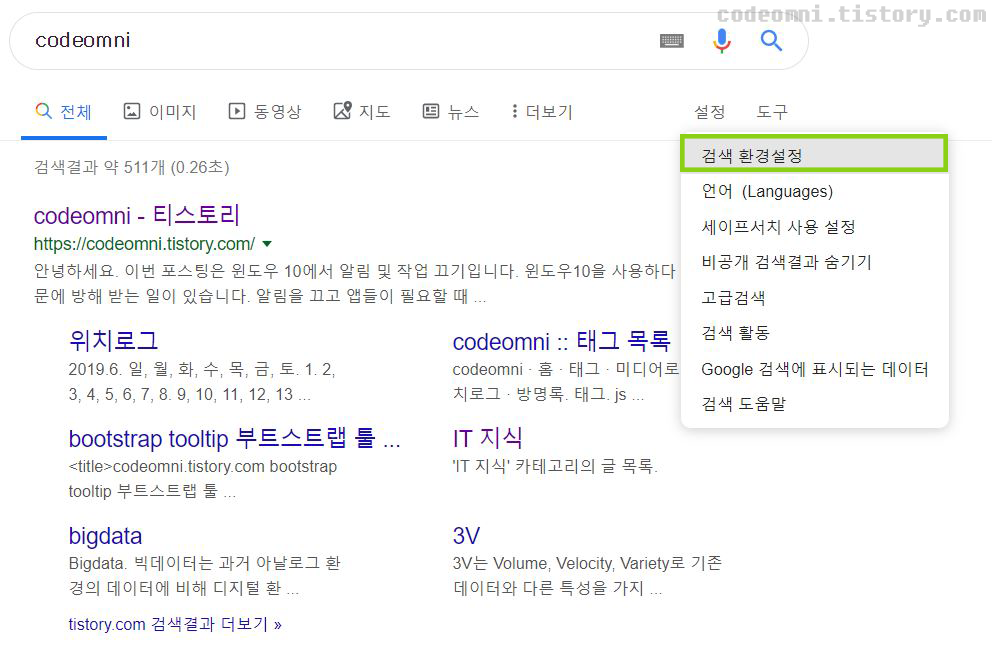 ▲ 검색한 내용들 중에서 탭을 보시면 설정 버튼이 있습니다.