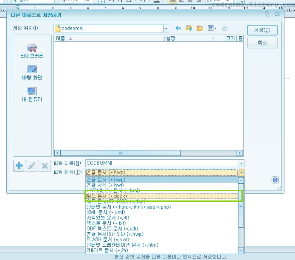 ▲ 저장할 때 파일 형식(T)을 워드 문서 (*.docx)로 저장합니다.