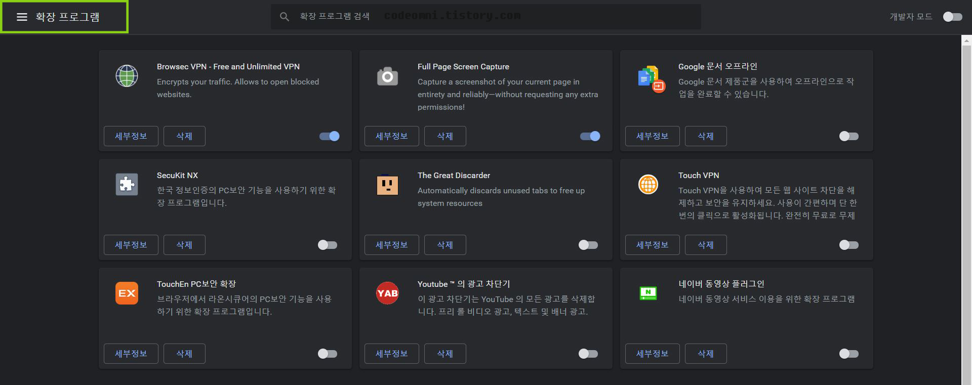 ▲ 현재 설치되어 있는 확장 프로그램들을 확인할 수 있습니다.