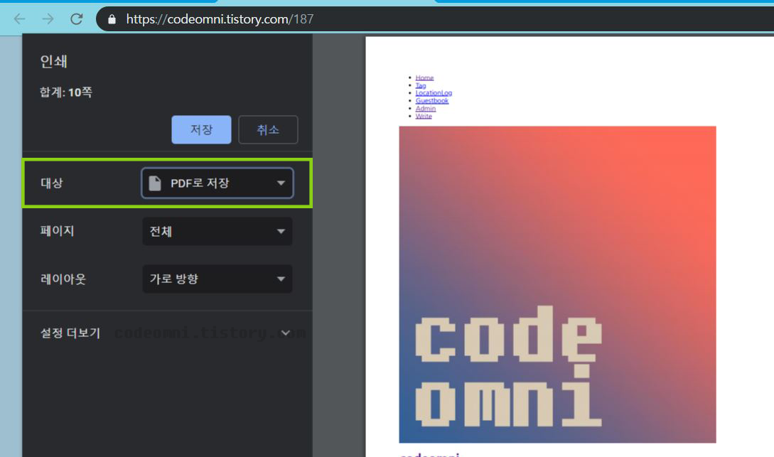 ▲ 인쇄 페이지 중 대상을 클릭하여 "PDF로 저장"을 선택합니다.