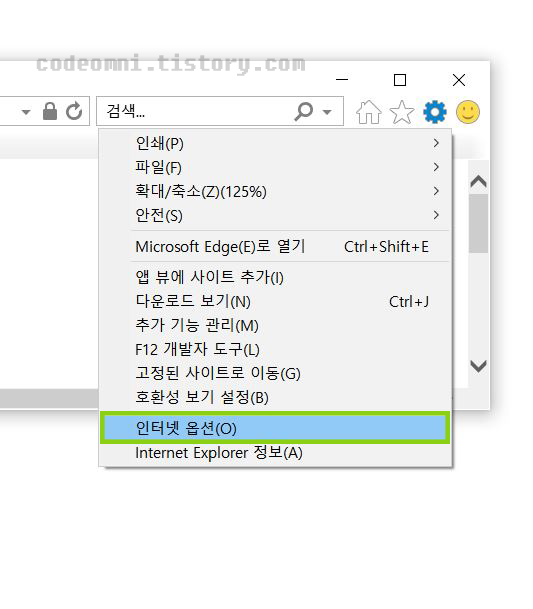 ▲ 먼저 오른쪽 상단에 있는 설정 아이콘을 클릭하여 인터넷 옵션(O)에 들어갑니다.