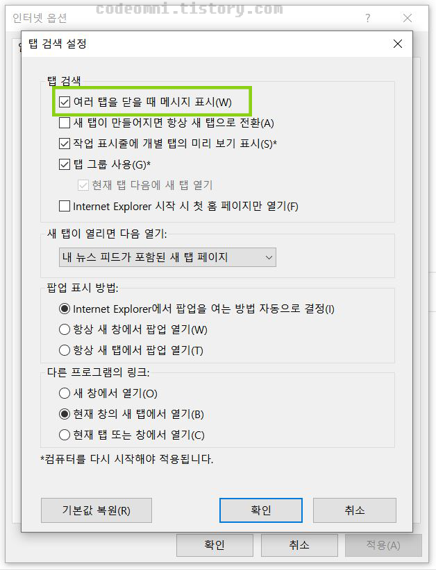 ▲ 탭 검색에 있는 여러 탭을 닫을 때 메시지 표시(W)를 체크하여 확인 버튼을 클릭합니다.