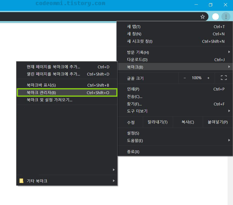 ▲ 오른쪽 상단에 있는 메뉴를 클릭하여 북마크(B) - 북마크 관리자(B)를 클릭합니다.