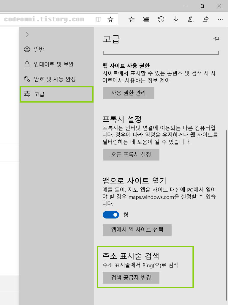 ▲ 스크롤해서 주소 표시줄 검색의 검색 공급자 변경을 클릭합니다.