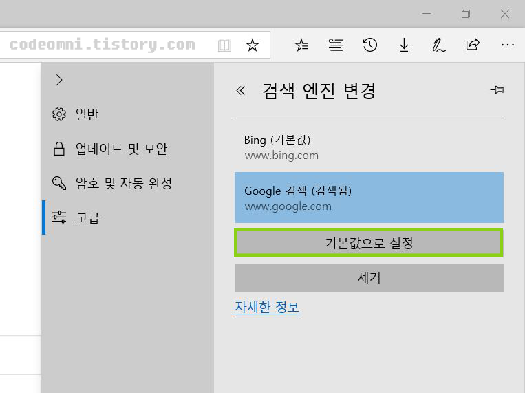 ▲ 원하는 검색 엔진을 선택한 후 기본값으로 설정하기 버튼을 클릭합니다.