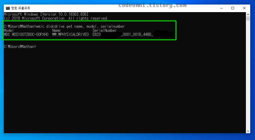 ▲ 명령어 wmic diskdrive get name, model, serialnumber를 입력합니다.