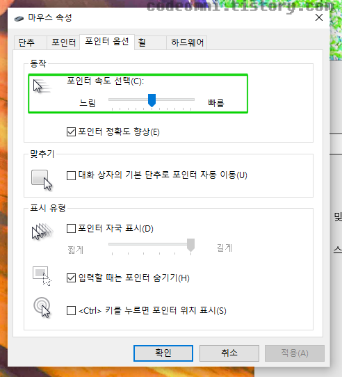 ▲ 포인터 옵션 탭에서 동작- 포인터 속도 선택(C) 클릭하여 원하는 속도를 지정합니다.