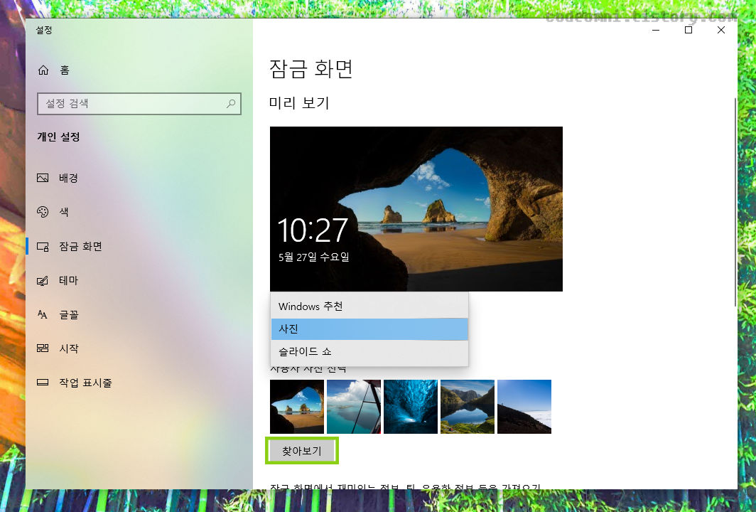 실행되는 잠금화면을 원하는 사진으로 변경할 수 있습니다.