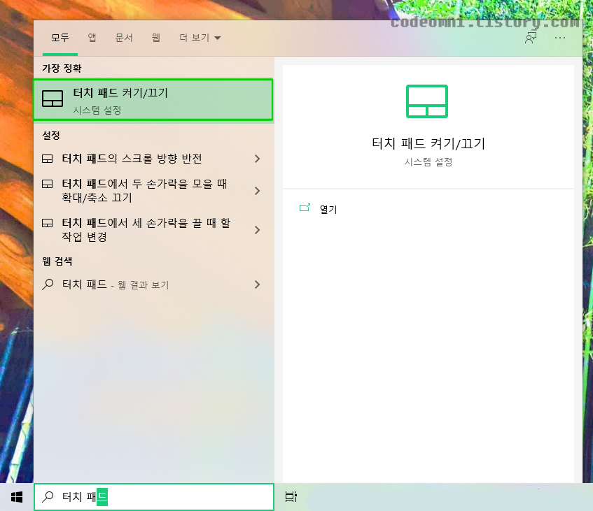 ▲ 검색에서 터치 패드 켜기/끄기를 검색합니다.