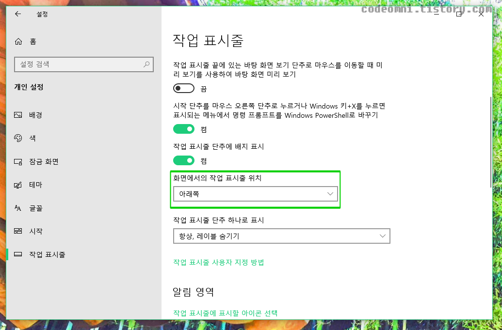 ▲ 작업 표시줄의 설정 값 중에 화면에서의 작업 표시줄 위치를 클릭합니다.