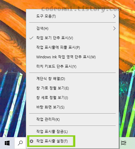 ▲ 작업 표시줄 설정(T) 를 클릭합니다.