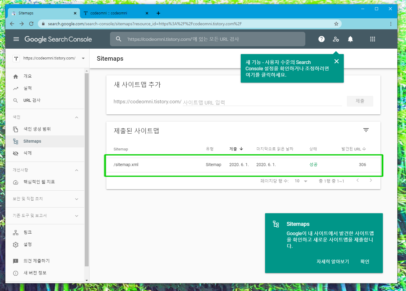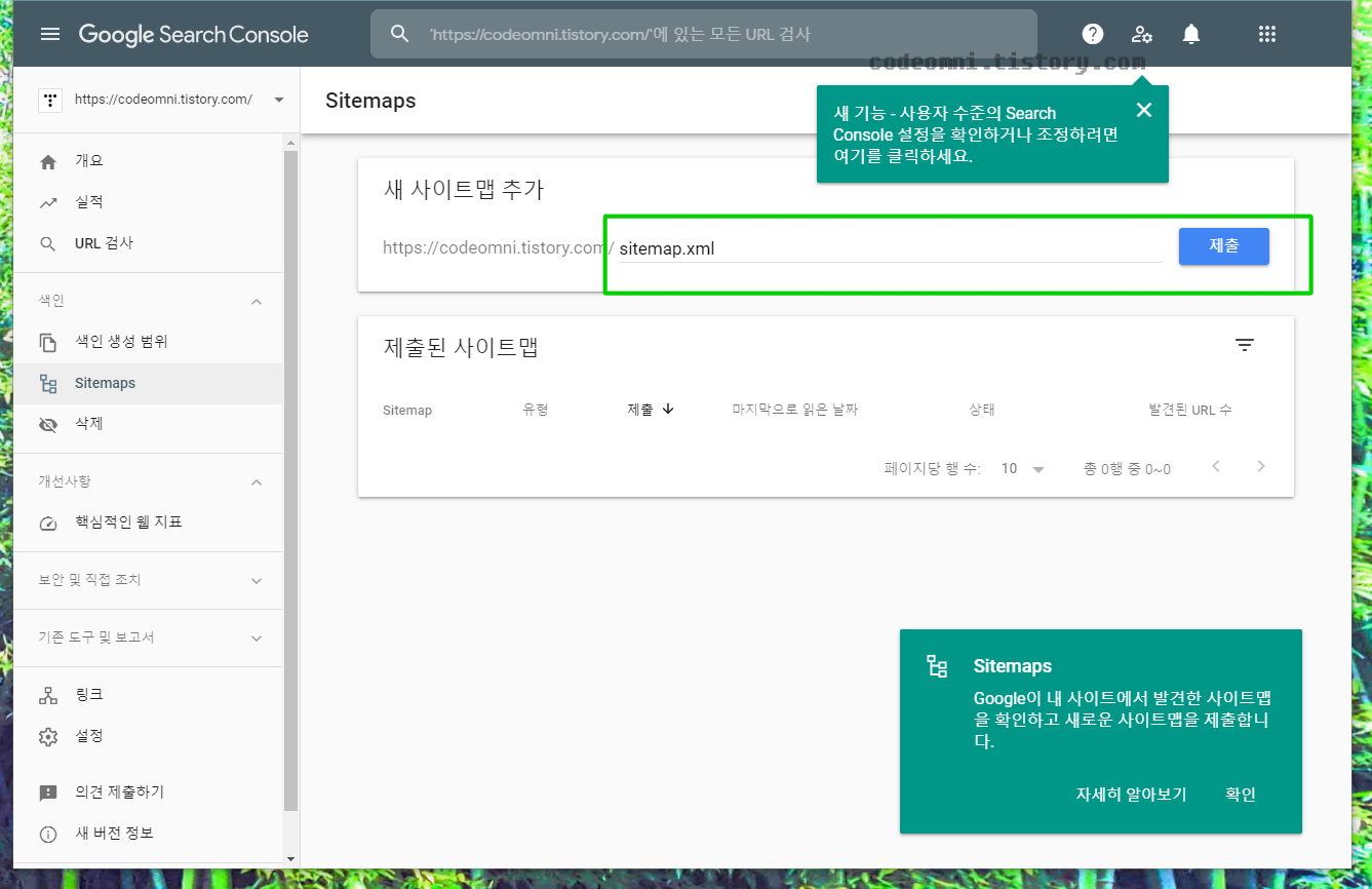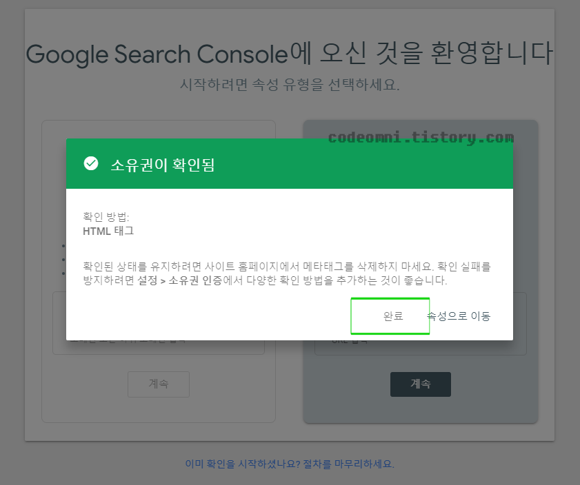 ▲ 완료 버튼을 눌러 구글 서치 콘솔에서 추가적인 기능을 설정할 수 있습니다.