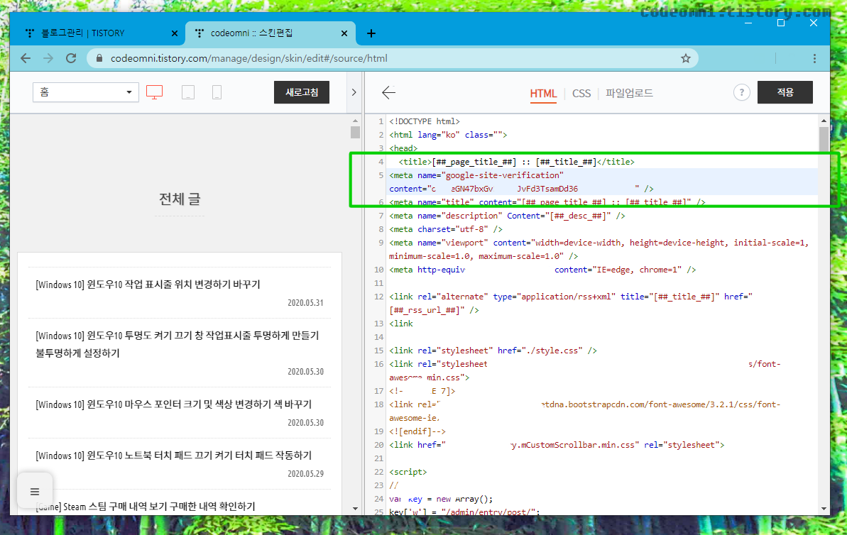 ▲ HTML을 선택한 뒤 <head>와 </head> 사이에 붙여넣고 적용 버튼을 클릭합니다.