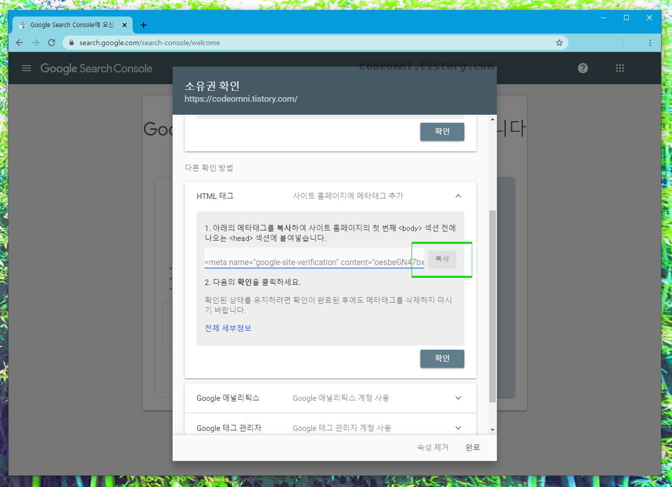 ▲ 복사 버튼을 클릭하여 메타태그를 복사합니다.