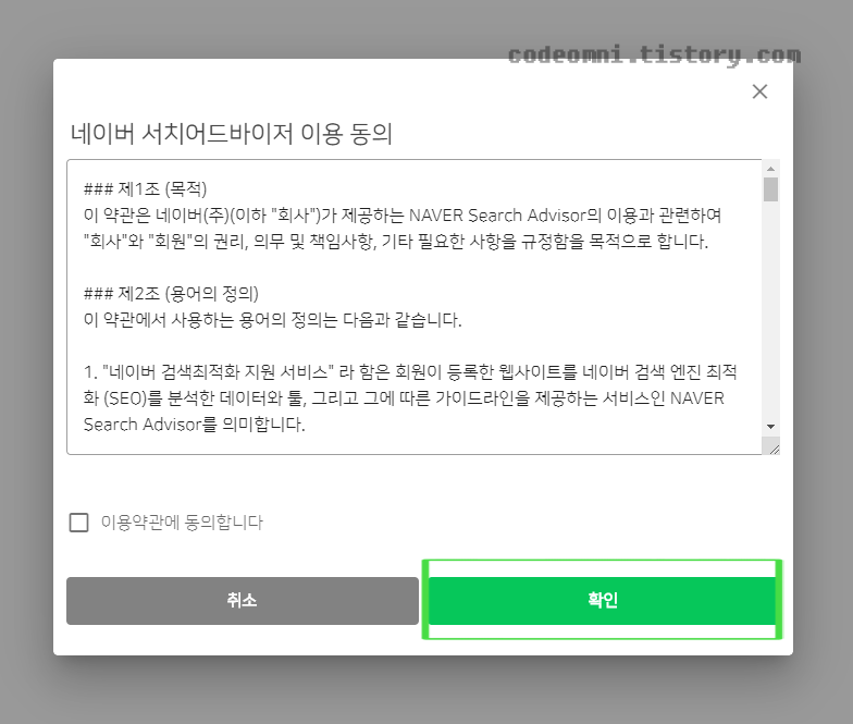 ▲ 이용약관에 동의 후 확인 버튼을 클릭합니다.