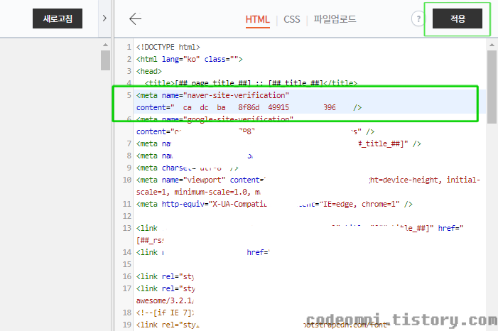 ▲ HTML을 선택한 뒤 <head>와 </head> 사이에 붙여넣고 적용 버튼을 클릭합니다.