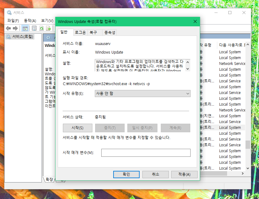 [OS] 운영체제/[Windows 10] 윈도우 10 [Windows 10] 윈도우 자동 업데이트 끄기 by codeomni 2020. 7. 11. 반응형 안녕하세요. 이번 포스팅은 윈도우10 에서 자동업데이트 끄기입니다. ▲ 서비스를 검색합니다. ▲ 설정 중에 Windows Update를 클릭합니다. ▲ 시작 유형(E)을 사용 안 함으로 변경합니다. 공유하기 게시글 관리 codeomni 저작자표시 비영리 변경금지 (새창열림) 댓글
