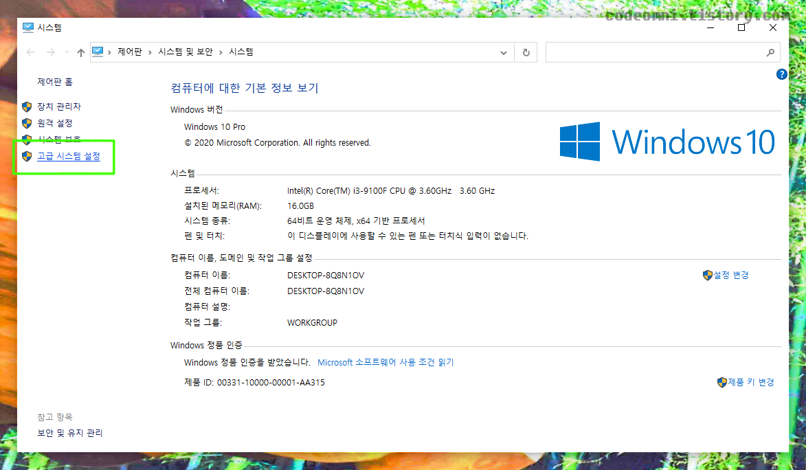 ▲ 왼쪽 상단에 위치한 고급 시스템 설정을 클릭합니다.