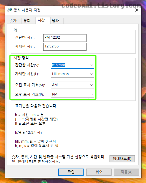 ▲ 시간 탭에서 시간 형식을 변경하면 간단한 시간, 자세한 시간, 오전, 오후 표시 기호를 변경할 수 있습니다.