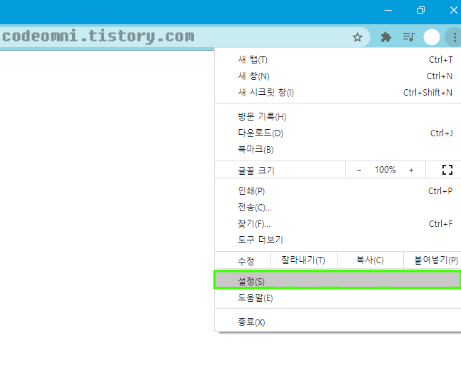 ▲ 메뉴 버튼을 클릭해서 설정(S)을 클릭합니다.