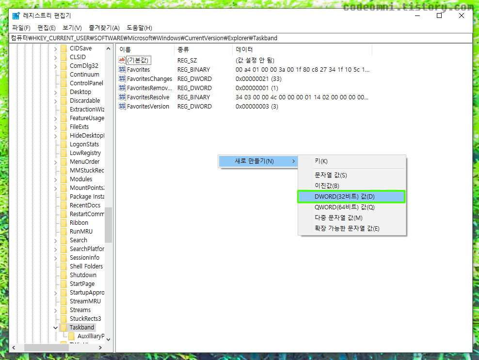 ▲ 컴퓨터\HKEY_CURRENT_USER\SOFTWARE\Microsoft\Windows\CurrentVersion\Explorer\Taskband