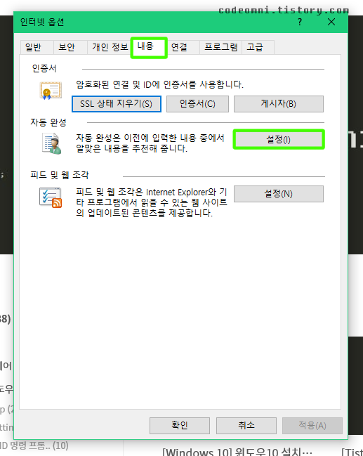 ▲ 내용 탭에 있는 자동 완성의 설정(I)을 클릭합니다.