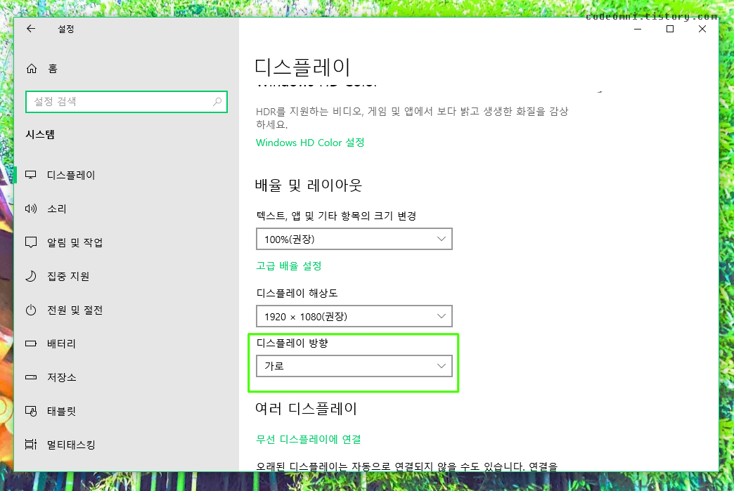 ▲ 배율 및 레이아웃에서 디스플레이 방향을 변경합니다.