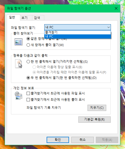 이번 포스팅은 윈도우10에서 파일 탐색기 열기 내 PC로 지정하기입니다.