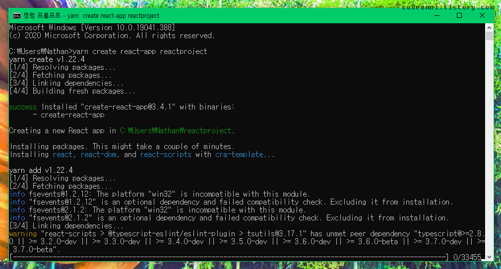 ▲ 명령어 yarn react-app "프로젝트 이름"을 입력합니다.