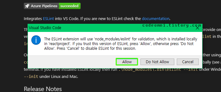 ▲ ESLint를 버전을 신뢰할 경우 "Allow"을 클릭합니다.
