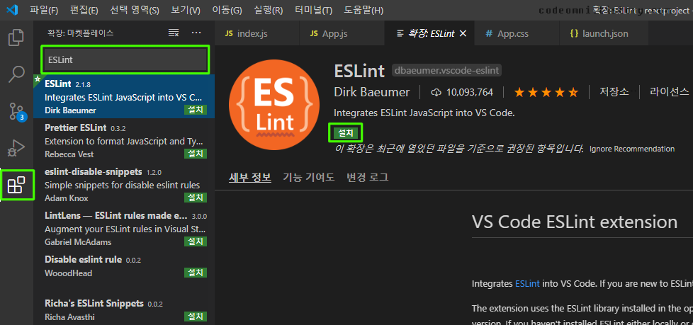 ▲ VS Code에 왼쪽 확장 메뉴 들어가서 ESLint를 입력하여 설치합니다.
