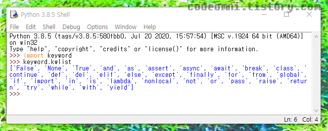 ▲ import keyword로 키워드 모듈을 가져옵니다.