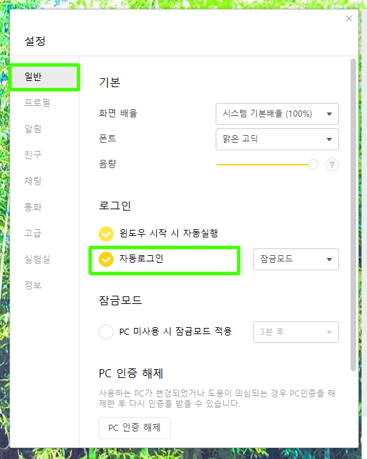 카카오톡PC 버전의 자동로그인 설정을 변경합니다.