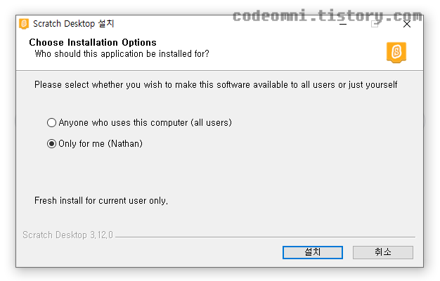 ▲ 스크레치를 설치할 사용자를 선택할 수 있습니다.