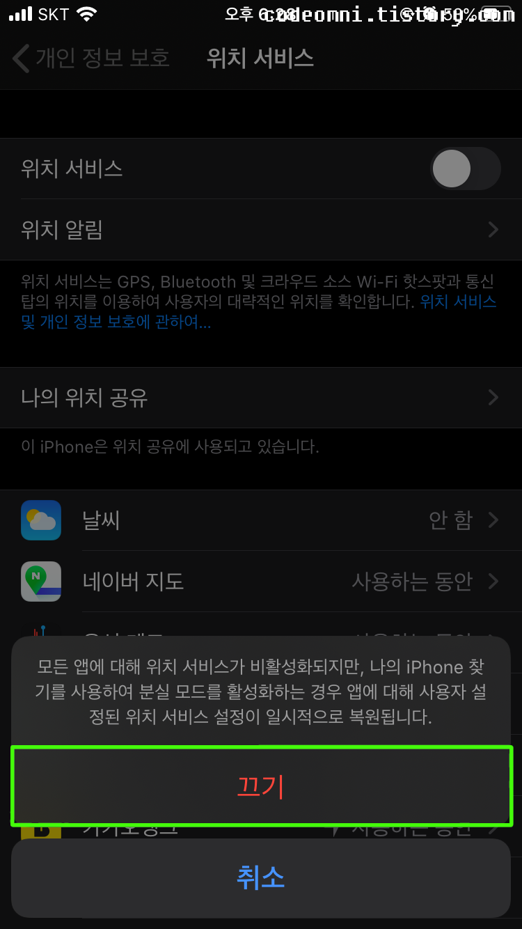 ▲ 위치 서비스를 터치해서 끕니다.