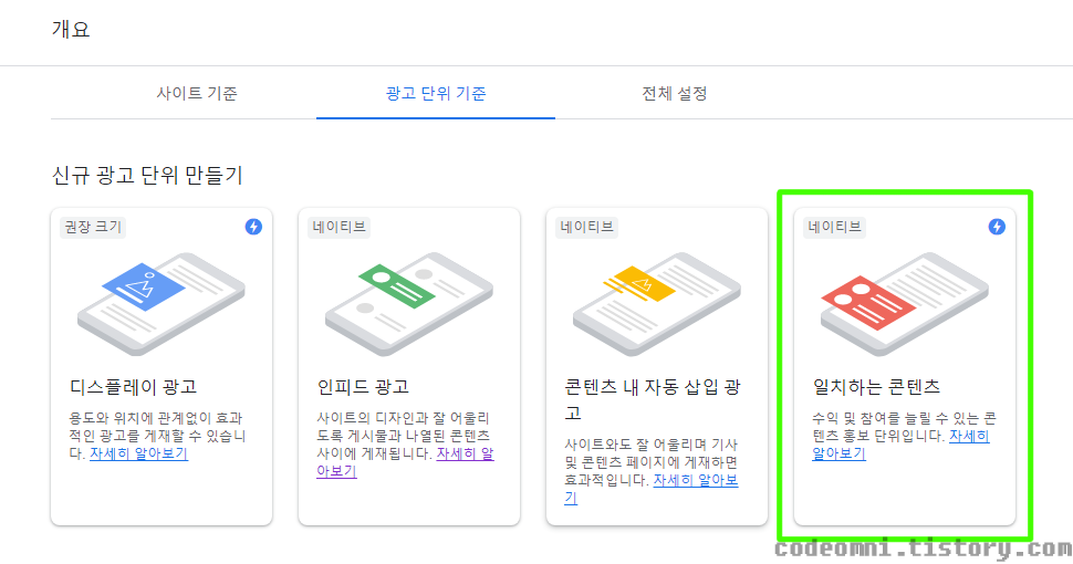 ▲ 상단의 위치한 메뉴에서 광고 단위 기준을 클릭합니다.