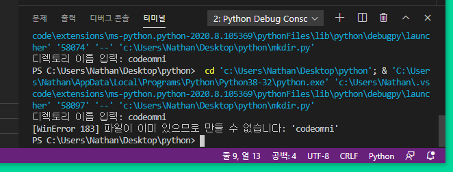 ▲ except as 구문으로 같은 이름을 입력할 경우 예외 처리합니다.